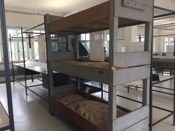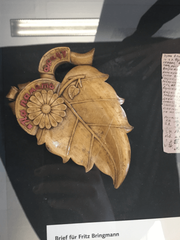 Auf dem weitläufigen Gelände hatten wir die Möglichkeit uns zum Teil noch original erhaltene Gebäude anzusehen. In den Holzbarraken, die mittlerweile nicht mehr erhalten sind, wohnten bis zu 1000 Menschen auf engstem Raum, obwohl diese nur für 100 Menschen ausgelegt waren. Dies führte dazu, dass sich drei Insassen ein Bett teilen mussten. Die schlechten Bedingungen wurden durch zu wenig Essen und harte Arbeit verstärkt. Der Alltag der Häftlinge bestand nur darin bis zu 12 Stunden zu arbeiten und den Befehlen der SS-Männern Folge zu leisten. In einem anderen Gebäude befindet sich jetzt eine vielfältige Ausstellung mit Originalstücken, die sich alle gerne anschauten. Ein interessantes Ausstellungsstück war ein geschnitztes Blatt, welches ein Häftling einem anderen zum Dank schenkte und das für den Besitzer Fritz Bringmann von ganz besonderem Wert war. Es wurde auch eine der Uniformen ausgestellt, die die Häftlinge zu tragen hatten. Zu jeder gehörte auch eine Nummer. Des weiteren befand sich auf der Uniform ein sogenannter Winkel, den es in verschiedenen Farben gab. Jede Farbe stand für eine bestimmte Gruppe: Zum Beispiel der rote für politisch Gefangene oder der rosafarbene für Homosexuelle, denn auch die galten als Feinde Hitlers.