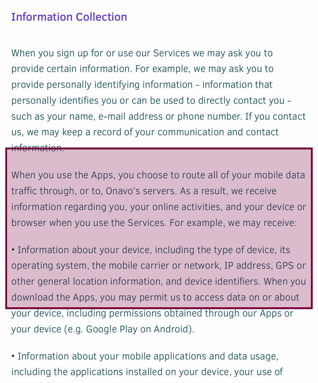 „To enable our Services, we receive all of your mobile data traffic, including location data, after you download and agree to use our Apps, which direct your mobile data traffic through or to our server. We may also receive personally identifying information such as your name, email address, or other contact information.“ [Quelle: Onavo, Datenschutzerkärung]