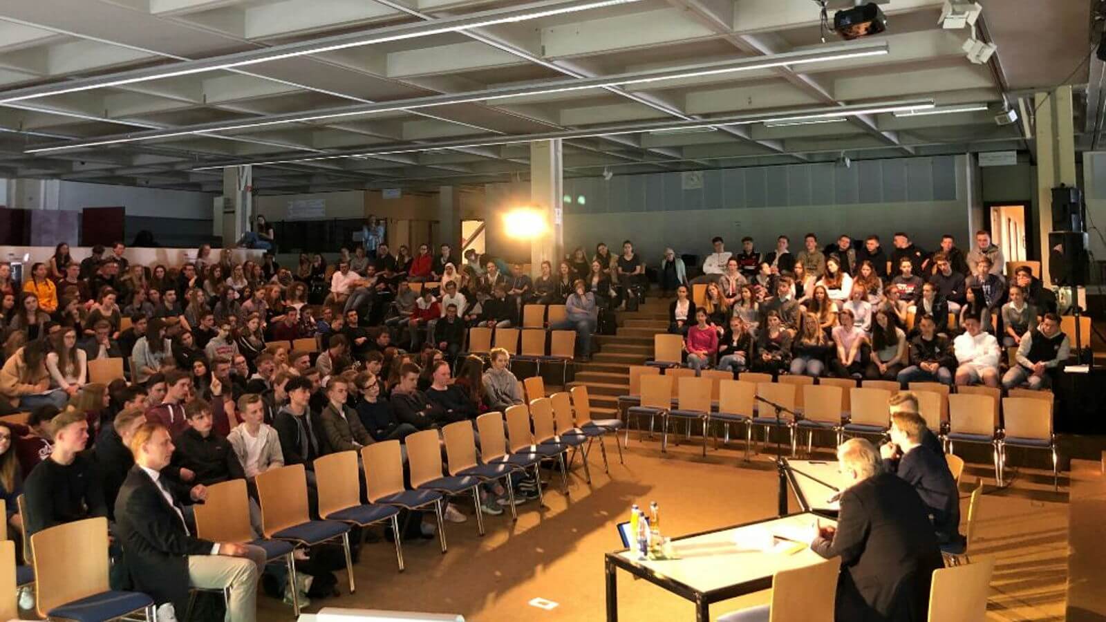 Im Rahmen von Schülerfragen kam dann das Thema Waffenlieferungen im Allgemeinen und Waffenlieferungen an die Türkei im Speziellen zur Sprache. An diesem Punkt entbrannte eine erste sehr lebhafte Diskussion entlang der Frage, ob eine Demokratie wie Deutschland, die Grundwerte wie die Menschenwürde als ihren Markenkern ansehe, Waffen an die Türkei oder beispielsweise auch an Saudi-Arabien liefern dürfe?