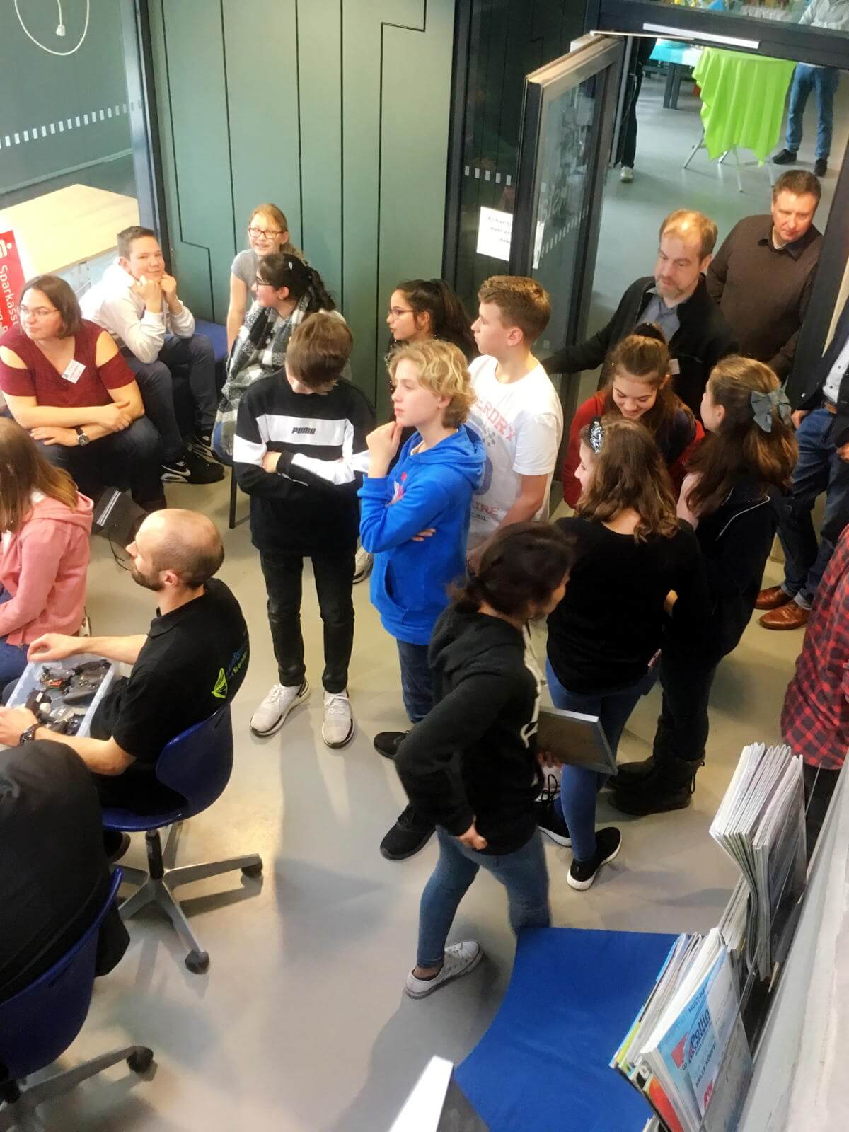 Der Heiner-Schönecke-Preis wurde in diesem Jahr zum ersten Mal von der Zukunftswerkstatt Buchholz mit dem Ziel vergeben, die beste MINT-Ideen von Schülerinnen und Schülern der Klassen 7 bis 13 in unserem Landkreis zu prämieren. Mit diesem Ziel hat sich die Klasse 7b unser Schule mit Unterstützung von Frau Söte, Frau Smolarek und Herrn Rick an die Entwicklung einer solchen Idee, aber auch an deren Umsetzung gemacht. Entstanden ist eine “Lärmampel”, die mit einem Arduino-Minicomputer und Sensoren verschieden einstellbare (RGB-)LEDs je nach Lärmpegel in der Klasse ansteuert. Insgesamt 400 LEDs wurden in die Innenseite aufgeschnittener Tetrapaks verbaut und bilden nun einen großen Bildschirm zur Anzeige des Lärmpegels.