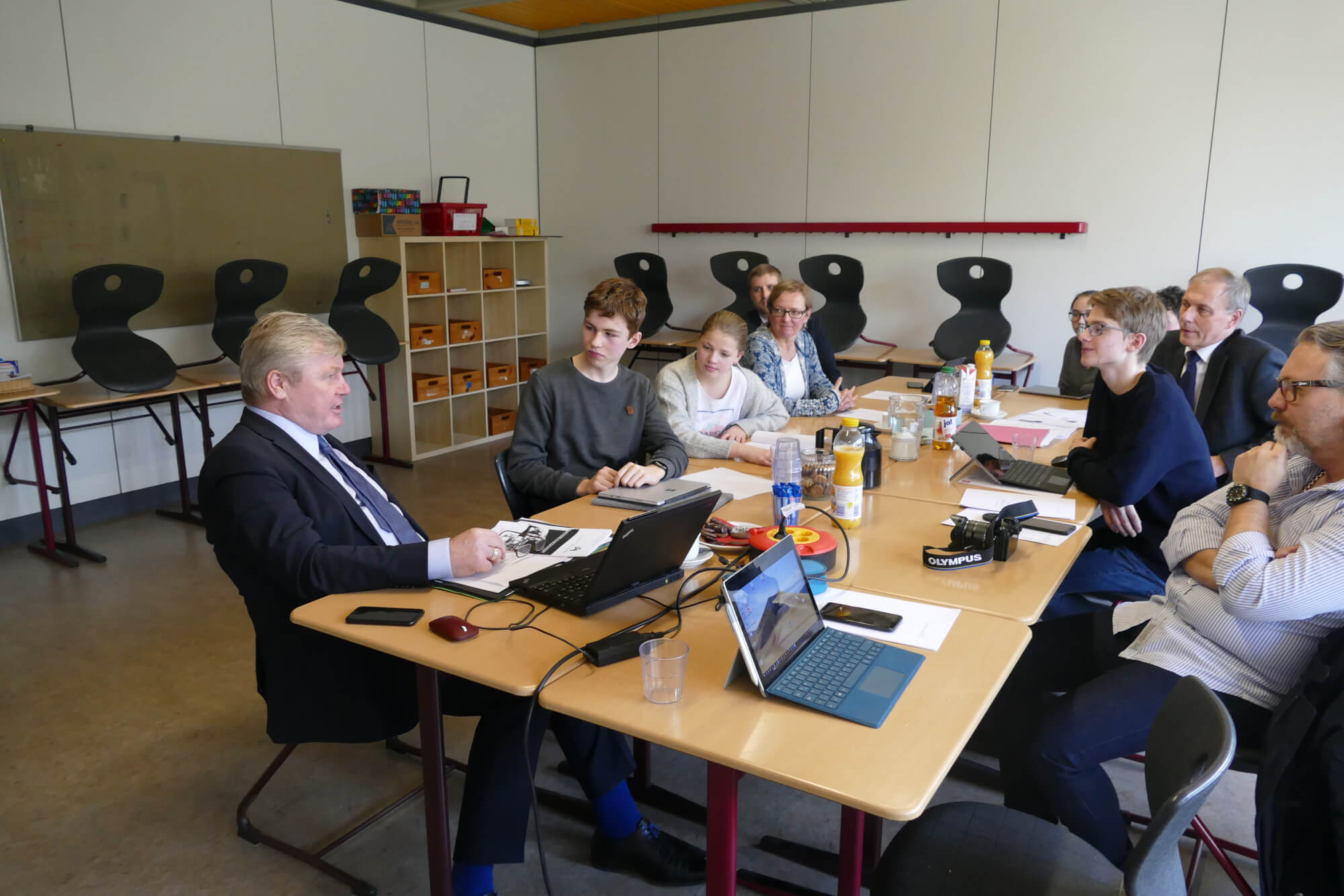 KompetenzPapier QR-Codes im Fachunterricht (144 Downloads ) ZukunftsPapier Digitalisierung (329 Downloads )Und so wurde er um 14 Uhr mit seinem Büroleiter Herrn Wildemann ankommend von den Schülervertretern Hanna Leni Wellen, Zoe Johanna Pielhau, Leif Lebender, Julian Leroux, Oskar Sepe und Frederik Sprave in Raum 011 begrüßt. Diese hatten sich nicht nur inhaltlich und mit verschiedenem technischen Auschauungsmaterial auf das Gespräch vorbereitet, sondern auch mit Erfrischungsgetränken sowie Keksen für eine angenehme Atmosphäre gesorgt.