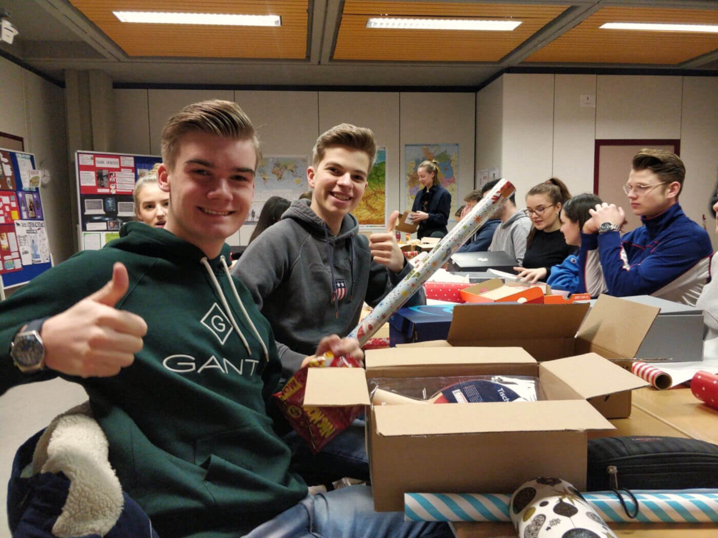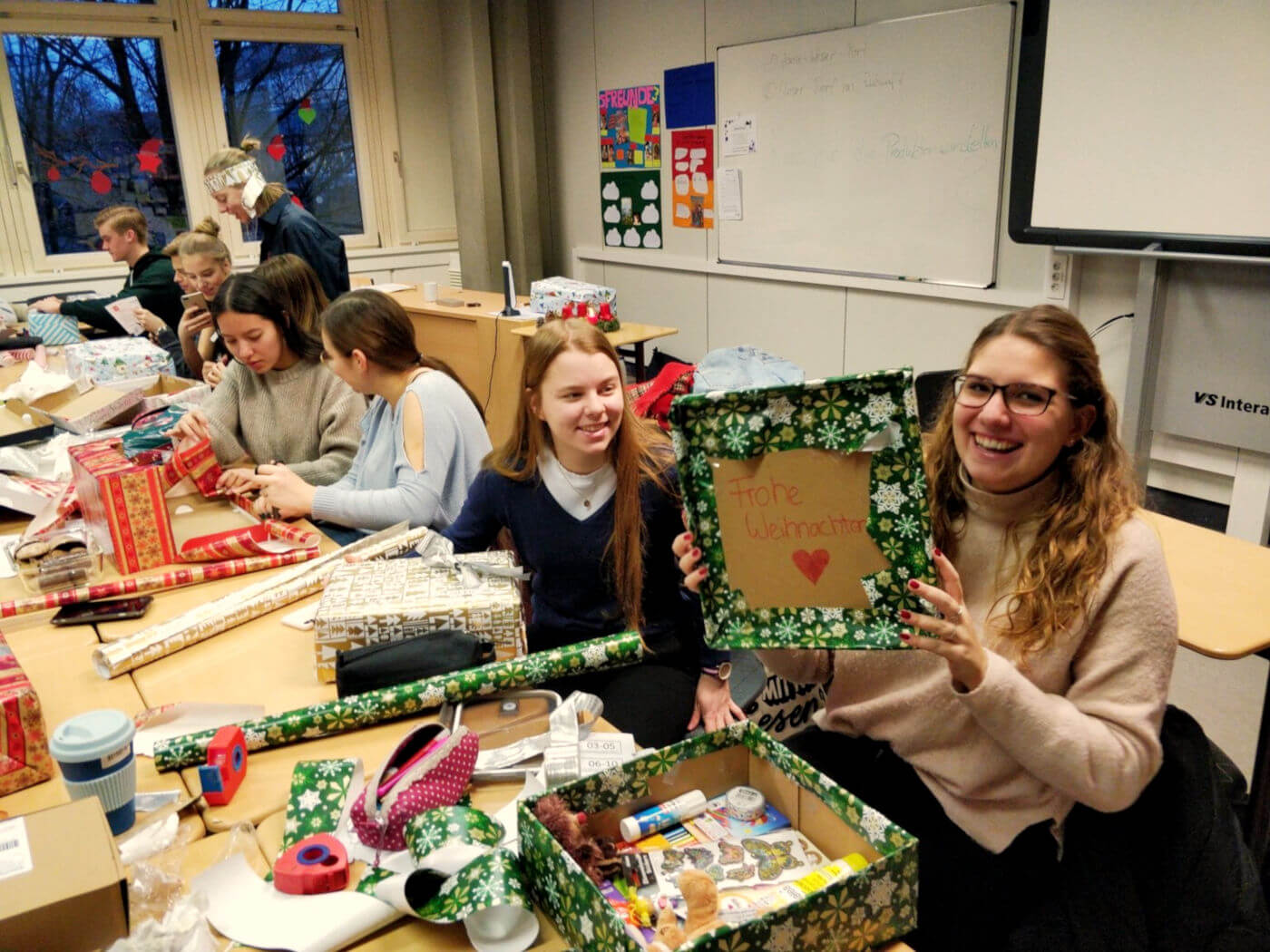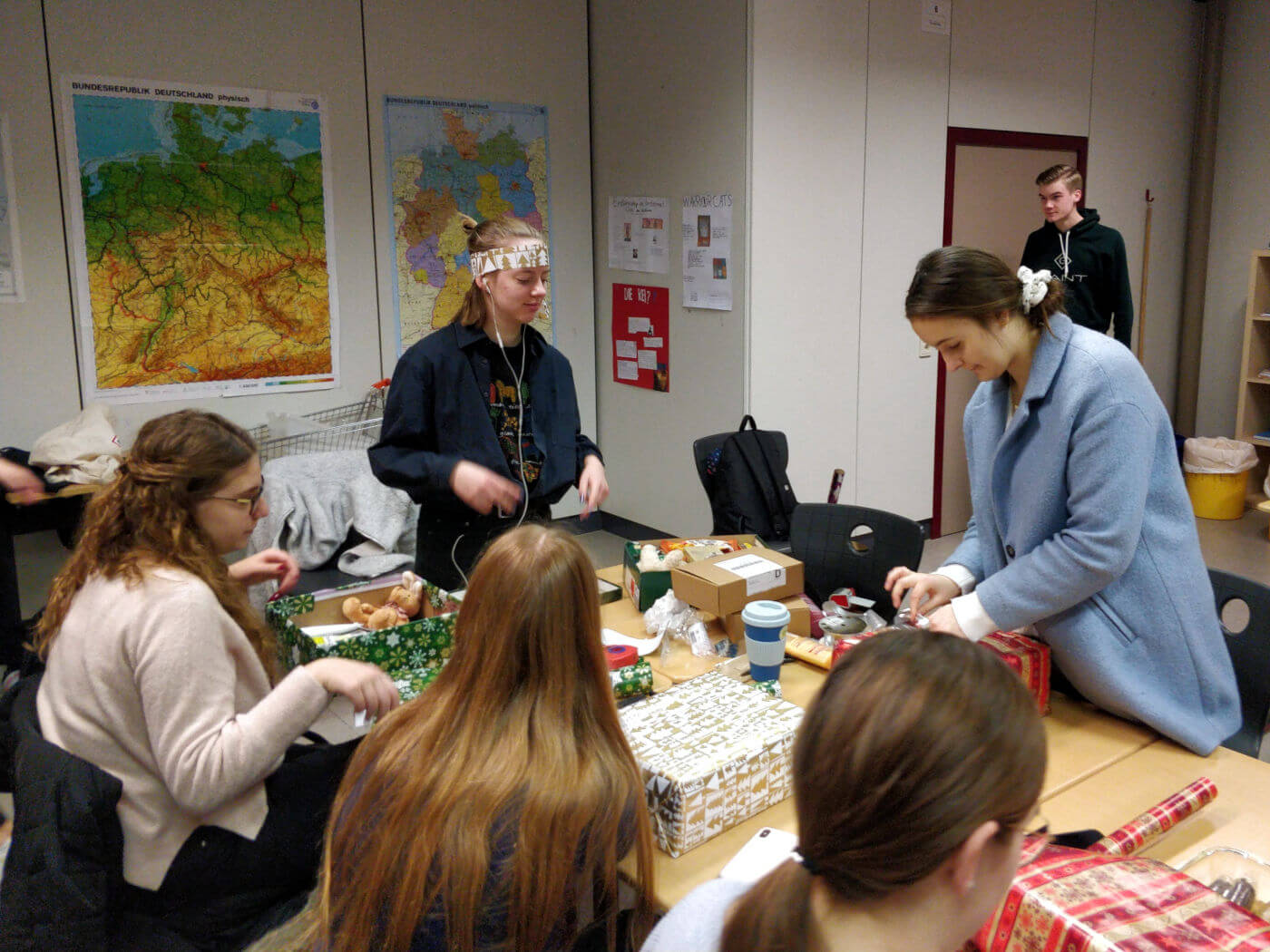 Nach einer basisdemokratischen Abstimmung im Kurs und Absprachen in der Signal-Gruppe brachten die Schülerinnen und Schüler Schuhkartons, Geschenke und reichlich Geschenkpapier mit in die freitägliche Doppelstunde, um gemeinsam ihre Weihnachtskartons für den guten Zweck zu packen, anstatt wie sonst mithilfe des Atlasses Geo- und Naturraumanalysen durchzuführen. Bei entspannter Atmosphäre mit ein wenig Weihnachtsmusik und leckeren Keksen verging die Zeit wie im Fluge. Nach der Doppelstunde konnten wir das großartige Ergebnis von 23 Weihnachtskartons verbuchen, die sich schön eingepackt im SV-Raum 001 stapelten. Ein voller Erfolg, der sogar das beeindruckende Engagement von der Klasse von Herrn Winter im letzten Jahr knapp übertraf, worauf wir besonders stolz sind.