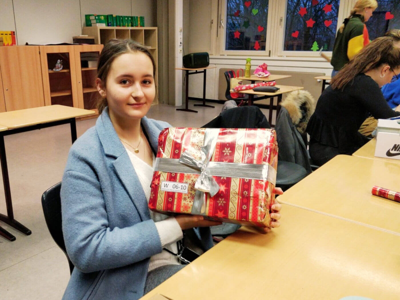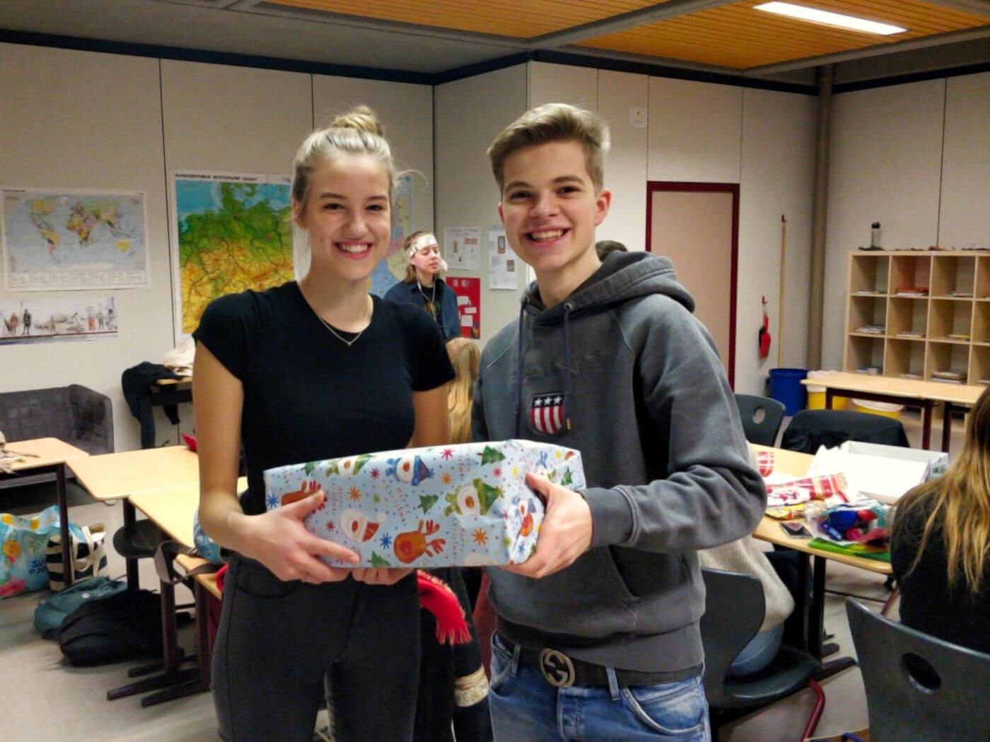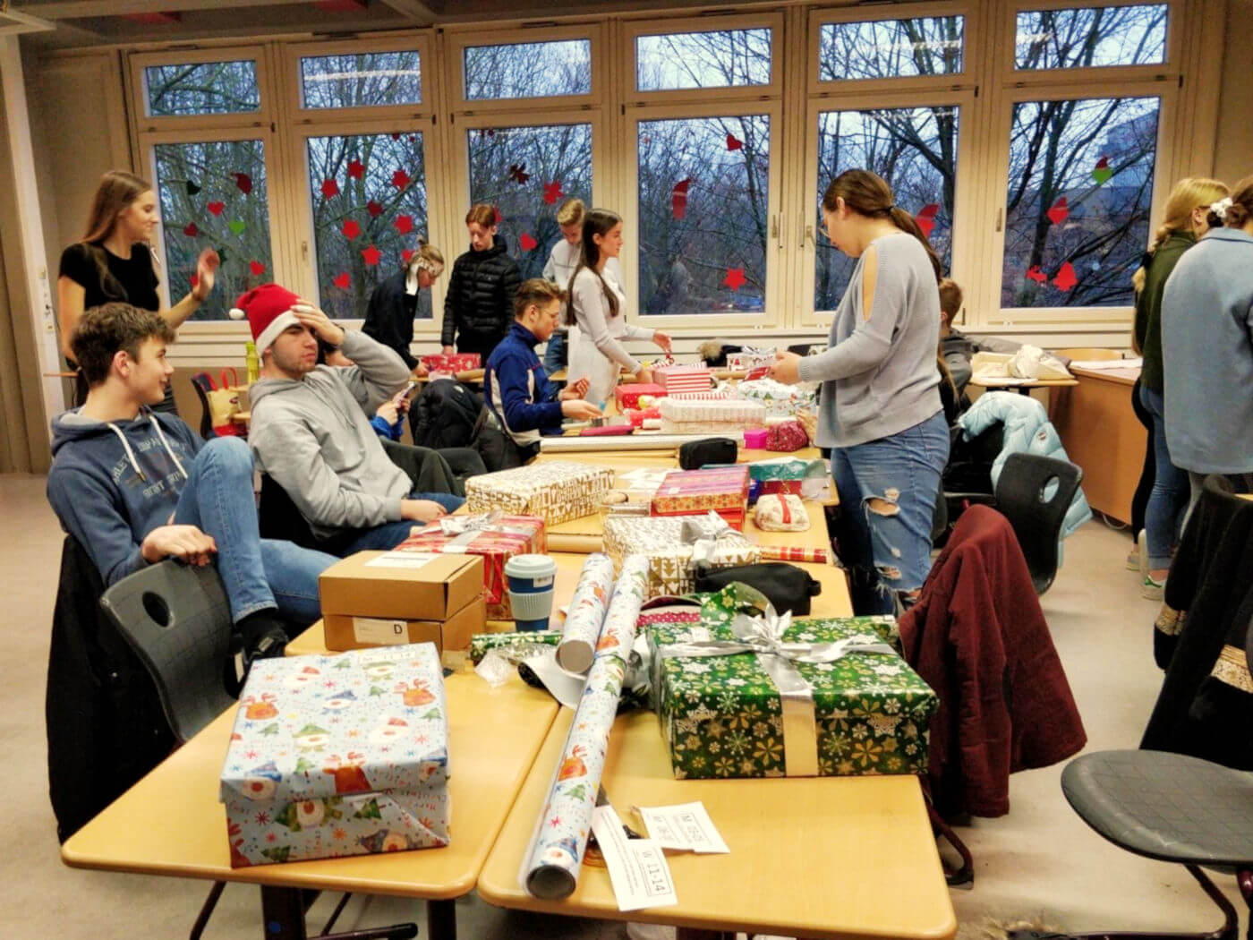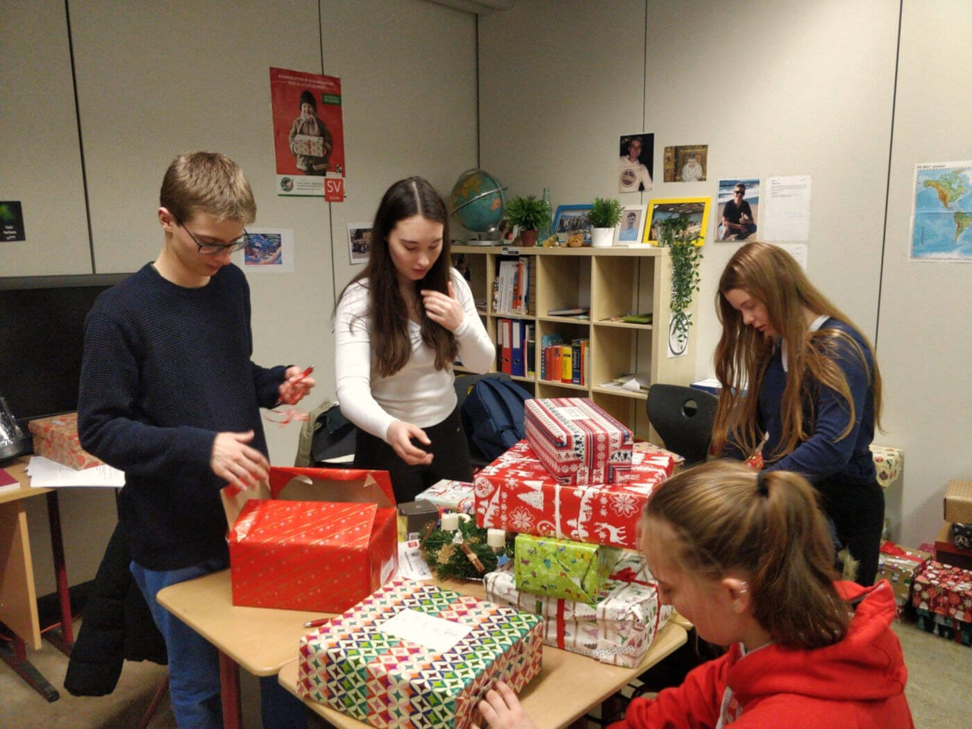 Nach einer basisdemokratischen Abstimmung im Kurs und Absprachen in der Signal-Gruppe brachten die Schülerinnen und Schüler Schuhkartons, Geschenke und reichlich Geschenkpapier mit in die freitägliche Doppelstunde, um gemeinsam ihre Weihnachtskartons für den guten Zweck zu packen, anstatt wie sonst mithilfe des Atlasses Geo- und Naturraumanalysen durchzuführen. Bei entspannter Atmosphäre mit ein wenig Weihnachtsmusik und leckeren Keksen verging die Zeit wie im Fluge. Nach der Doppelstunde konnten wir das großartige Ergebnis von 23 Weihnachtskartons verbuchen, die sich schön eingepackt im SV-Raum 001 stapelten. Ein voller Erfolg, der sogar das beeindruckende Engagement von der Klasse von Herrn Winter im letzten Jahr knapp übertraf, worauf wir besonders stolz sind.