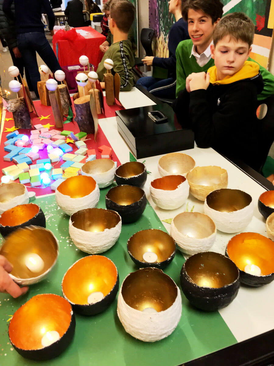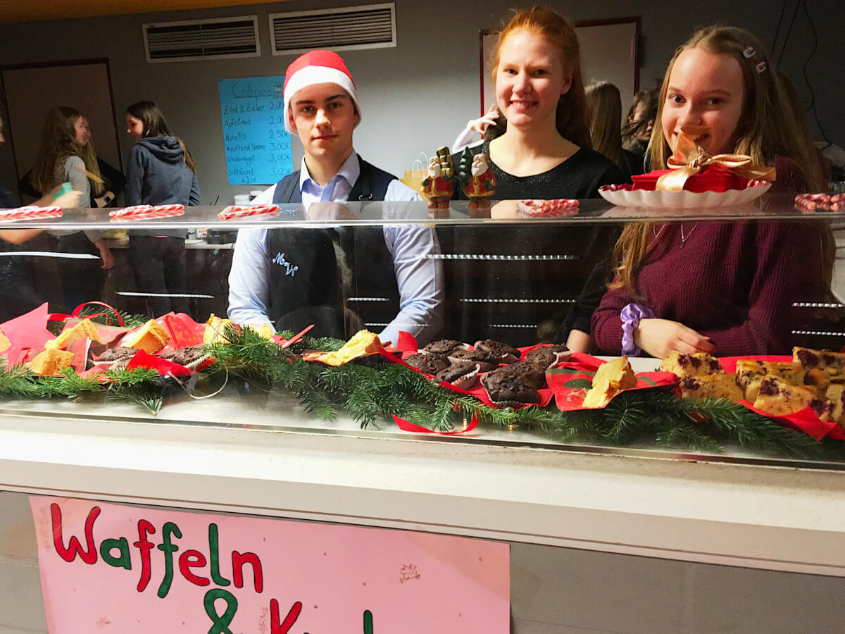 Am Tag des Weihnachtsbasars waren die Flure und Foren unserer Schule wieder mit vielen Besuchern gefüllt. Mit heißem Punsch, warmen Sandwiches, veganen Süßigkeiten und mit Kaffee, Plätzchen und leckerem Kuchen war für das leibliche Wohl gut gesorgt. Intensive Vorbereitungen, Planungen und Basteleien der Lehrer- und Schülerschaft waren dem vorweihnachtlichen Event vorausgegangen; sogar einen extra Projekttag für die Planung hatte es Anfang November gegeben.
