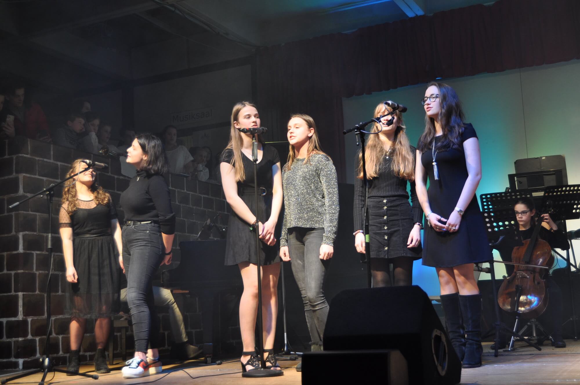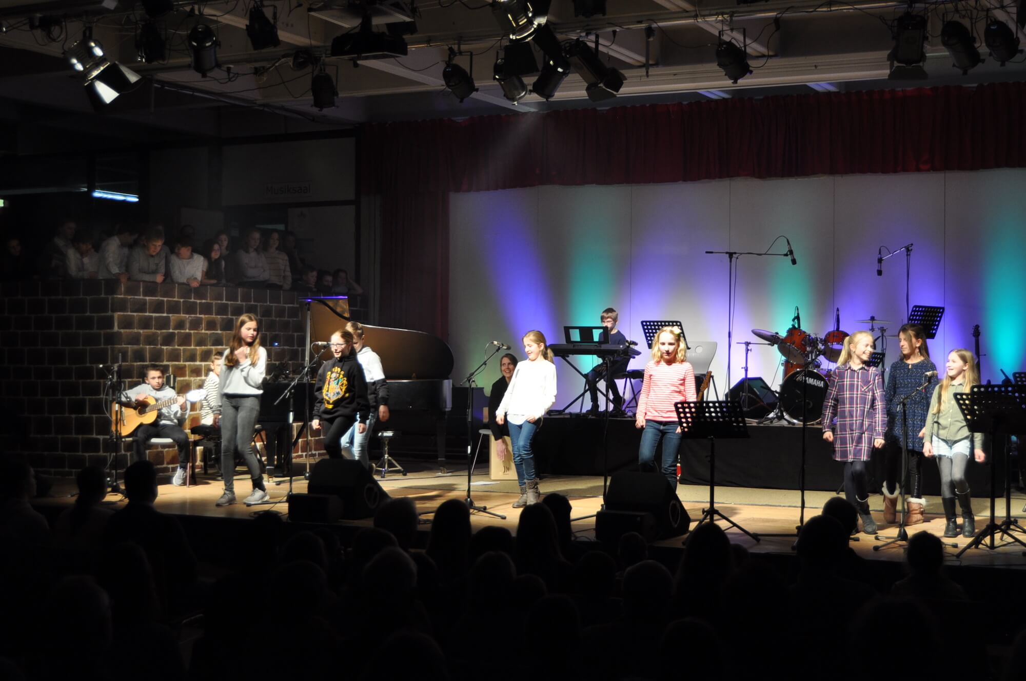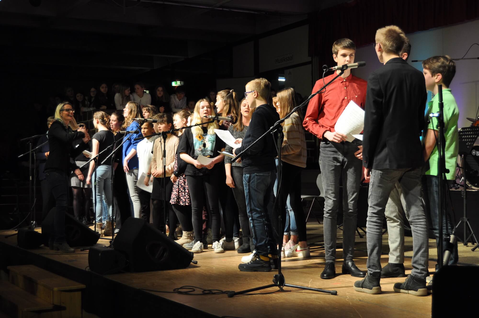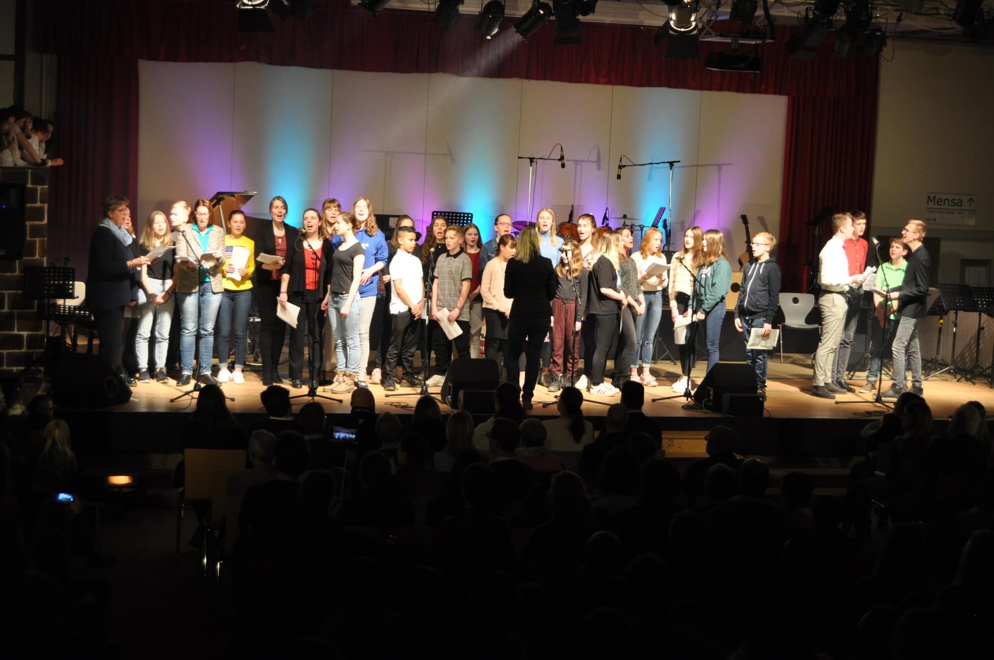 Gut eine Woche nach der probenintensiven Musikfahrt ins Schloss Dreilützow gehörte die Bühne des Forums mehr als 120 musikbegeisterten SchülerInnen unseres Gymnasiums. Rund 400 ZuhörerInnen waren gekommen, um die kleinen und großen Künstler beim Winterkonzert am 14.02.20 live zu hören und zu erleben. Der Funke sprang über und die gute Stimmung sowohl bei den SchülerInnen als auch beim Publikum wird allen Beteiligten noch lange in Erinnerung bleiben. Mit einem sehr abwechslungsreichen Programm (von Rachmaninov bis Mark Forster) sowie mit viel Charme und Talent überzeugten die MusikerInnen das begeisterungsfähige Publikum und ernteten dafür großen Applaus und zahlreiche Spenden. Deutlich zu hören und zu spüren waren die „Nachklänge“ der Musikfahrt – die intensiven Proben hatten sich gelohnt und gaben den Aufführenden die nötige Sicherheit bei den einzelnen acts und das intensive Miteinander auf der Fahrt war auch beim Konzert hinter den Kulissen und auf der Bühne sehr präsent. Zu hören waren nicht nur die Ensembles unserer Schule (Bläserklassen 5 & 6, der Schüler-Lehrer-Chor, die Musical-AG, die Daydreamers und trøt), sondern auch talentierte Gesangs-,Cello-, Klarinetten-, Wort-, und KlaviersolistInnen. Aber auch das Publikum war aktiv dabei und wurde durch das humorvoll-schlagfertige Moderatorenteam Winter/Wagner/Claus immer wieder musikalisch gefordert. Beim großen Finale mit allen Teilnehmern der Musikfahrt am Ende des Abends sang letztlich das ganze Forum – „So ist das Leben“ aus der aktuellen Musicalproduktion. Der Song begleitete noch so manchen als Ohrwurm nach Hause.