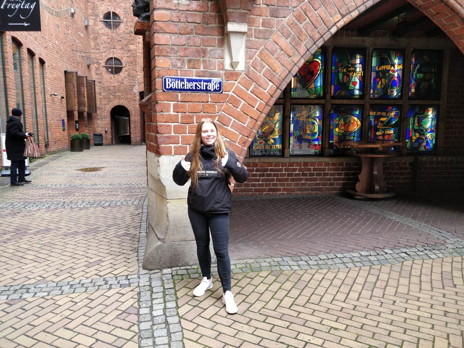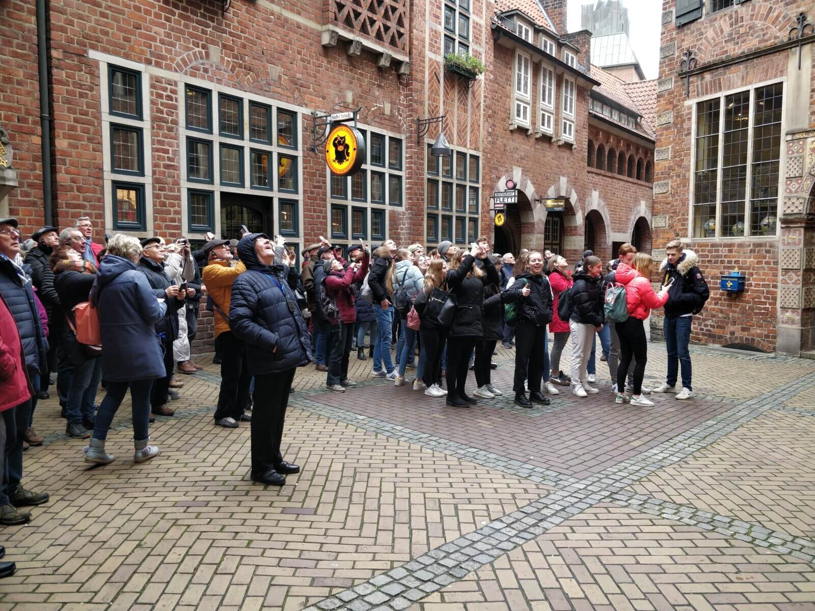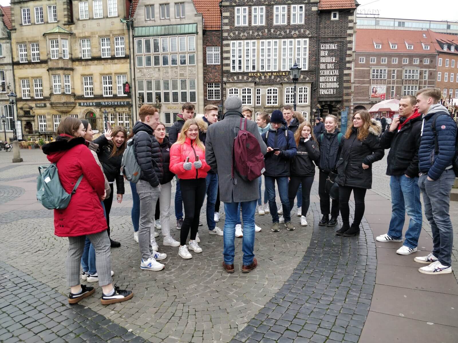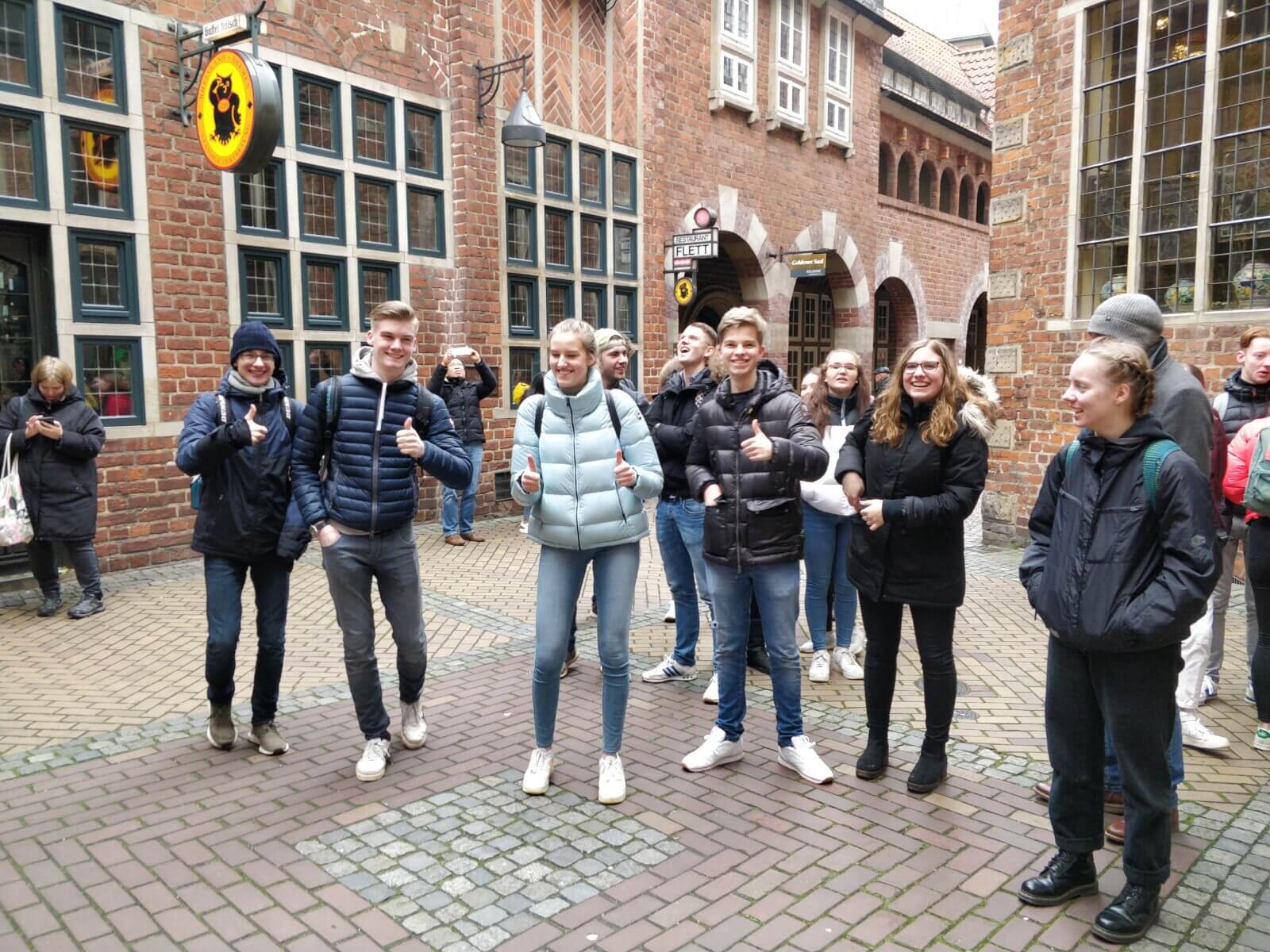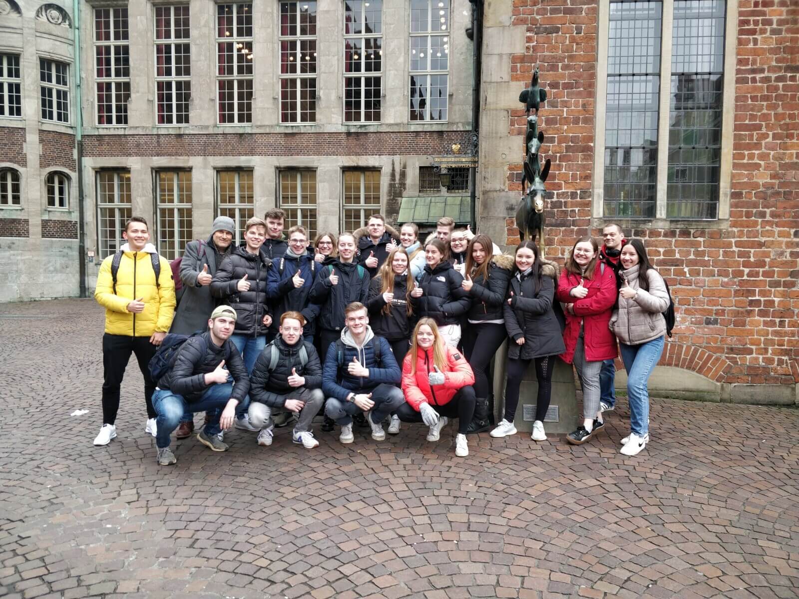 Am 27.02.2020 konnte es dann endlich losgehen – nach einem Treffen vor dem SV-Raum 001 wanderte der Kurs gemeinsam zum Bahnhof. Von dort aus ging es dann mit dem Zug nach Bremen, wo der Kurs im Kollektiv an einer Stadtführung teilnahm. Neben dem Roland, der Bürgerschaft und auch dem Dom wurde die Böttcherstraße als einer der Hauptattraktionen der Hansestadt besucht. Highlight war das berühmte Glockenspiel in der Böttcherstraße, was neben den Hittfeldern auch Reisegruppen aus Spanien und Frankreich angelockt hatte. Während des Aufenthaltes in Bremen wurde das im Unterricht erlangte Wissen zum Thema Stadtentwicklung mit dem Erlebten verknüpft und vertieft.