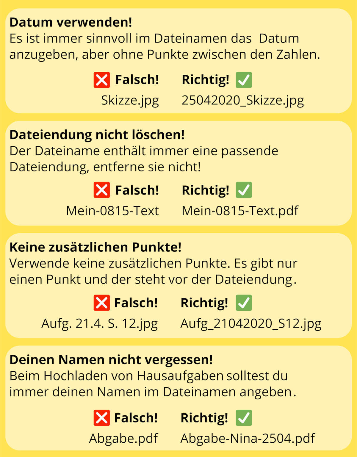 - Bei abgegebenen Hausaufgaben sollte ein Dateiname ebenfalls den Namen der Schülerin bzw. des Schülers enthalten. Beispielsweise: