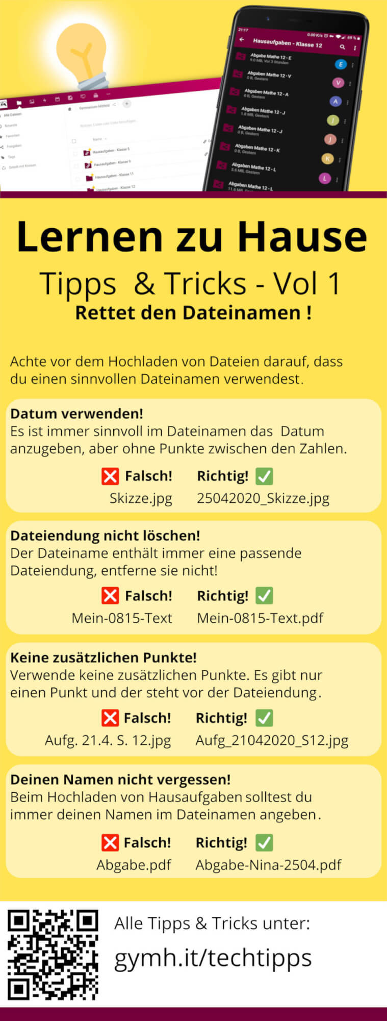 Parallel zu den hier ausführlich aufgeführten Tipps und Tricks werden von den #Webcoaches, der Schülervertretung und allen unseren Unterstützern kleine Mini-Ausgaben dieser Tipps per Messenger und Social-Media verteilt. Sie können hier auch heruntergeladen werden.