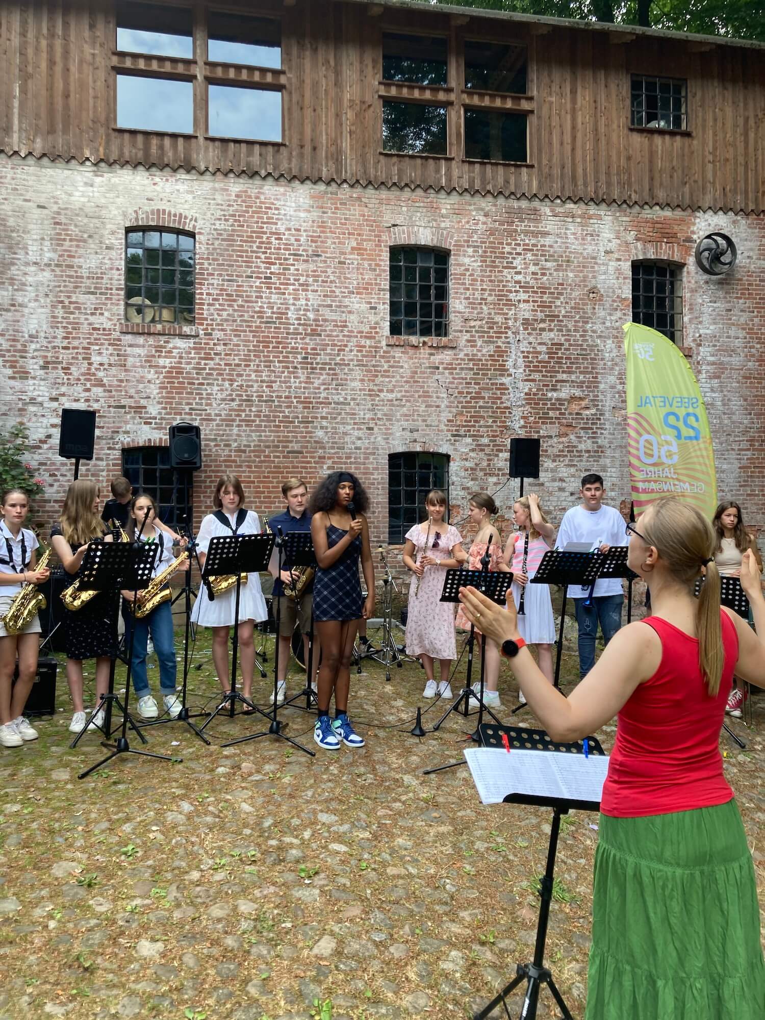 Am 26.06.22 um 17:00 eröffnete unsere Band AG unter der Leitung von Frau Mach und Herrn Zander das Picknickkonzert an der Wassermühle mit ihrem ersten externen Auftritt. Der historische Hof der Wassermühle war passend zu den Temperaturen sommerlich hergerichtet. Viele familiäre Fans der auftretenden Schulbands waren gekommen, um diese Premiere live mitzuerleben. Es war sowohl den Musiker*innen als auch dem Publikum anzumerken, wie sehr sich alle freuten, nach der Corona-Pause endlich wieder auftreten zu dürfen und Konzertatmosphäre zu erleben. Entsprechend wurden die gelungenen Songs unserer Mittelstufenband mit viel Applaus belohnt!