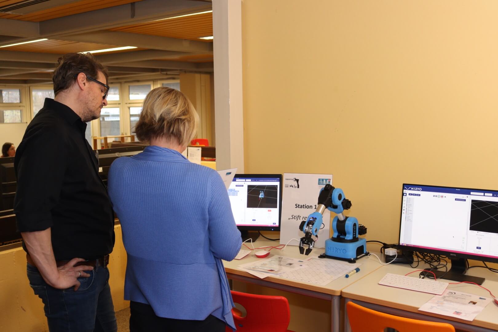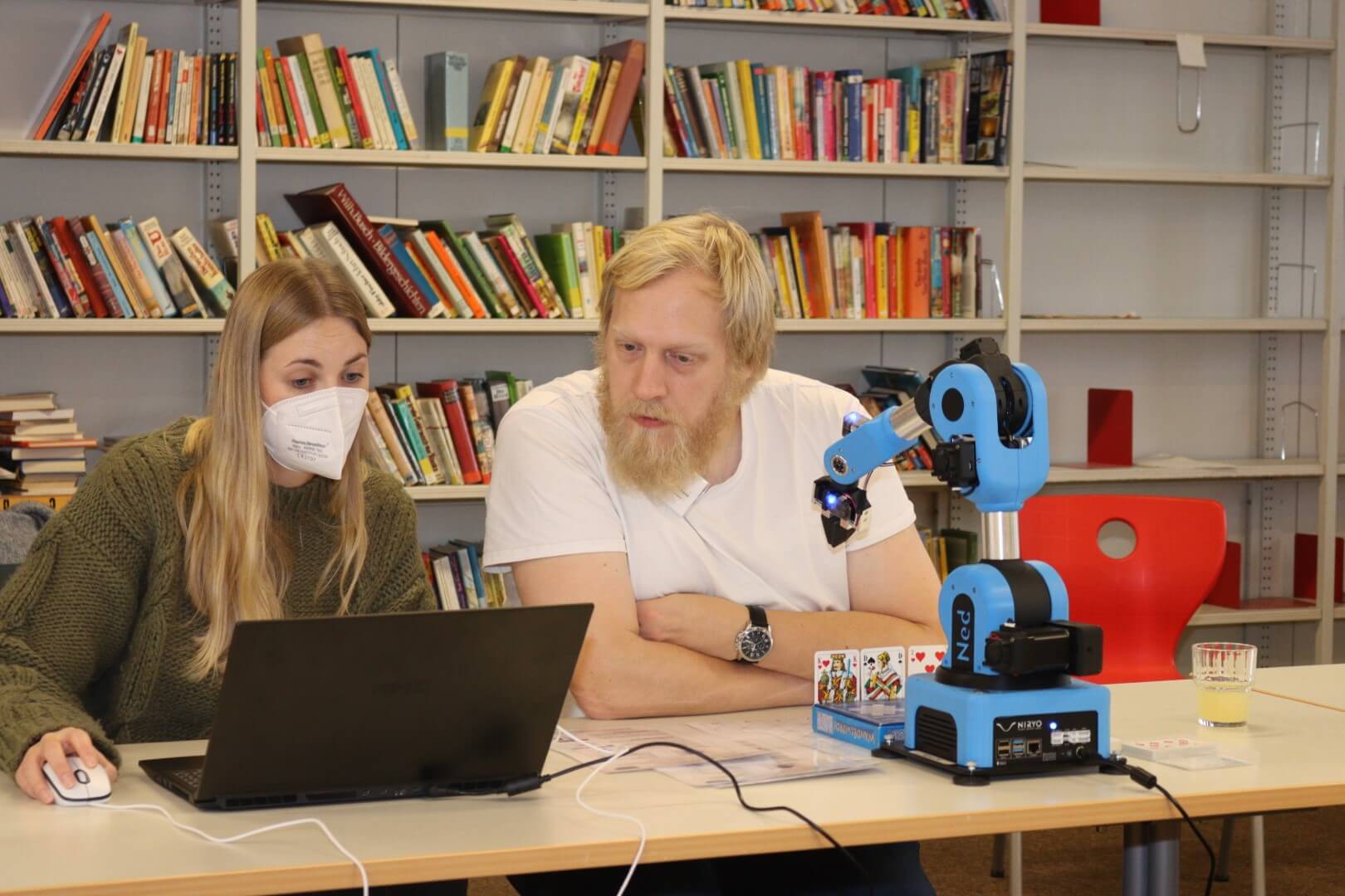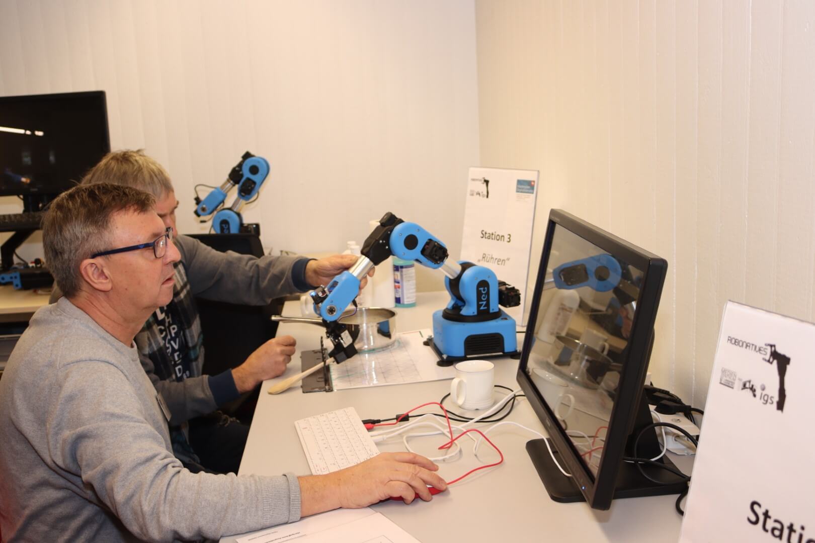 Neben tollen Einblicken in die unterschiedliche Gestaltung der anderen Projekte stand auch das praktische Arbeiten am Roboter im Zentrum des Treffens. Inspiriert von Schüler- und Lehrerideen wurde mit den Robotern, ganz im Sinne unserer Projektphilosophie “Mensch-Roboter-Kollaboration” zu zeigen, gerührt, Boot gefahren, ein Auto zusammengesetzt, Karten gespielt, sortiert und getanzt. Zudem wurde Material ausprobiert, bei dem Alltagssituationen in Algorithmen übertragen werden – ein spielerischer Ansatz zum Programmieren.