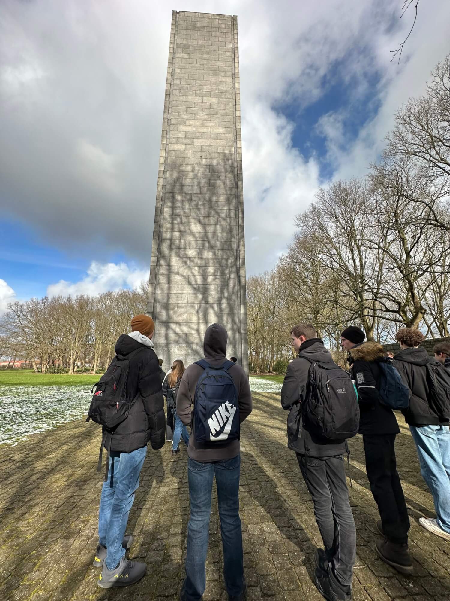 Unsere letzte Station mit Lucy war der offizielle Gedenkplatz auf dem eine 27 Meter hohe Stele mit der Aufschrift „Euer Leiden, Euer Kampf und Euer Tod sollen nicht vergebens sein“ sowie das internationales Denkmal zur Erinnerung die Opfer stehen. Die Größe der Stele hat die Funktion diese Zeit nicht zu vergessen. Nachdem wir uns von Lucy verabschiedet und bedankt hatten, blieben uns noch 35 Minuten Zeit, um das Haus und den Hain des Gedenkens zu besuchen. Dann stand gegen 14 Uhr der Rückweg an und wir kamen gegen 14:30 Uhr am Peperdieksberg an, wo nach einer kurzen Verabschiedung die Exkursion zu Ende ging.