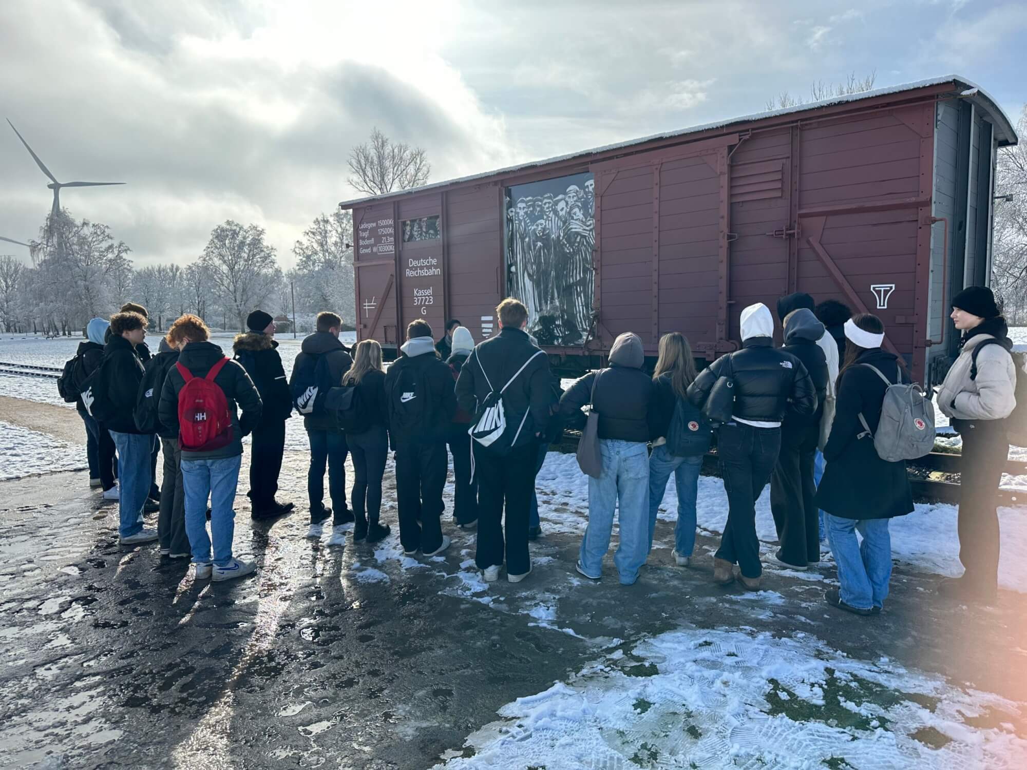 Am 06. März stand der Ausflug des 10. Jahrgangs zur Gedenkstätte des ehmaligen Konzentrationslagers in Neuengamme an. Kurz nach 8 Uhr verließen wir das Schulgelände und machten uns dorthin auf den Weg, wo wir gegen 9 Uhr ankamen. Nach einer kurzen Pause im Glashaus am Eingang trafen wir auf unseren Tourguide Lucy, welche uns kurz anhand eines Modells den Aufbau des Geländes erklärte, wobei erste Fragen beantwortet werden konnten. Schon machten wir uns auf den Weg zum ersten Stopp, einem Wagon der ehemaligen Deutschen Reichsbahn. Hier erzählte uns Lucy Genaueres über die Ankunft der KZ-Häftlinge in Neuengamme und wir konnten hier schon unser Vorwissen gut einbringen. Danach gingen wir an den Platz, auf dem in etwa das Krematorium des Konzentrationslagers gestanden hat. Dieser wird heute als Gedenkstätte genutzt, weil sich hier die Spur ihrer Angehörigen verliert, denn die Asche dieser wurde an verschiedenen Stellen des Geländes verteilt.