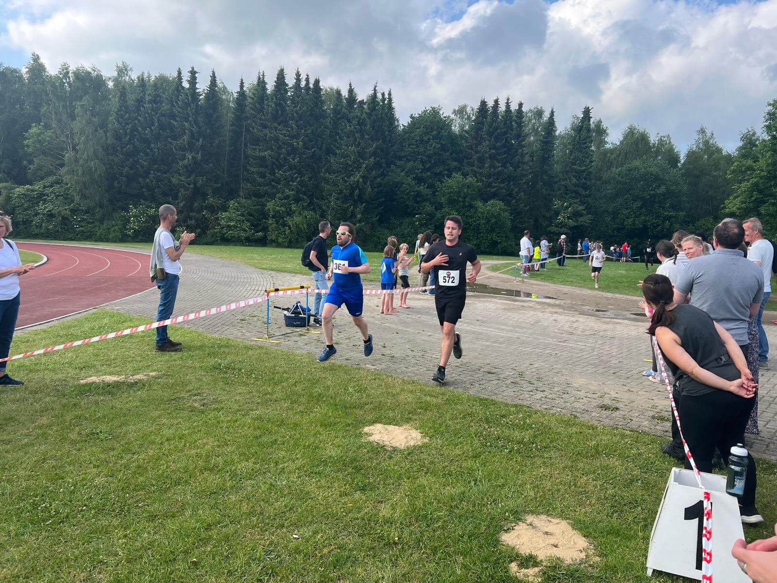 Wie jedes Jahr waren wieder viele Teilnehmende und Besucher auch aus anderen Orten beim Laufen dabei. Obwohl unser Gymnasium abermals nur die zweit-anmeldestärkste Gruppe war, traf man doch auf reichlich bekannte Mitstreiter. Von der fünften Klasse bis zur Lehrerschaft traten 84 Teilnehmende unseres Gymnasiums gemeinsam beim 4,5km-Lauf an. Somit können dem Haus Huckfeld 588€ von der Schule als Spende zur Verfügung gestellt werden. Der erfolgreichste Läufer der Schule beim 4,5km-Lauf erreichte von 374 Teilnehmenden den 12. Platz. Erstaunlich war außerdem das Anfeuern der Läufer durch jegliche Zuschauer am Rand der gesamten Strecke, egal ob durch Familie, Freunde, Lehrer oder sogar Unbekannte. Die Stimmung war dadurch absolut hervorragend. Bei der Siegerehrung wurden dann mit dem Angebot von Kuchen, Wurst und Getränken die Urkunden übergeben und der schöne Tag zum Ende gebracht.