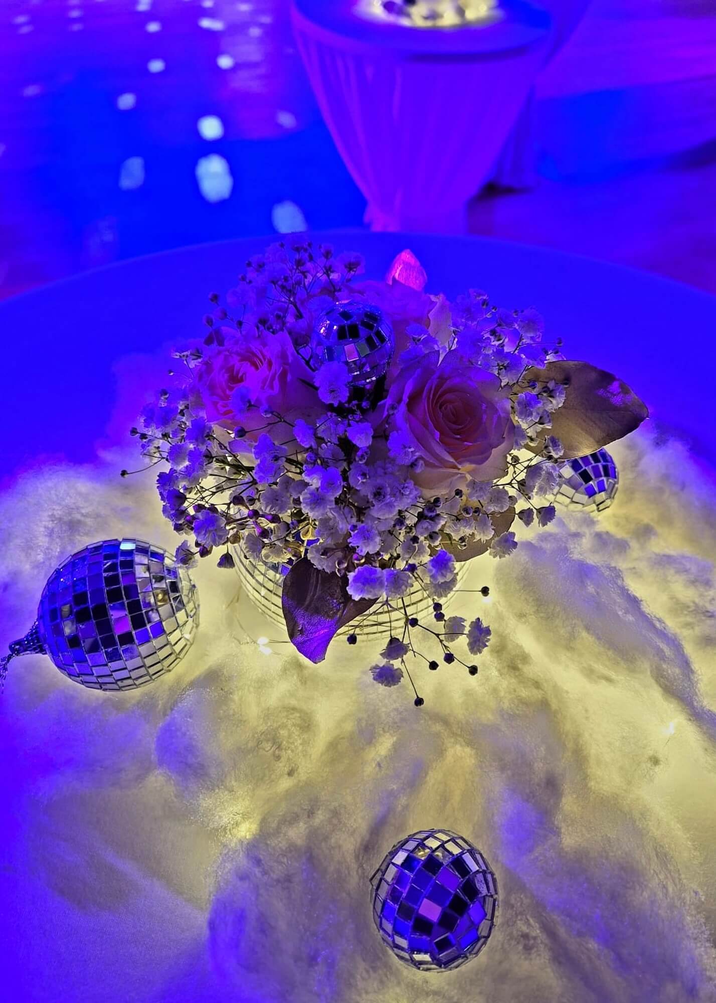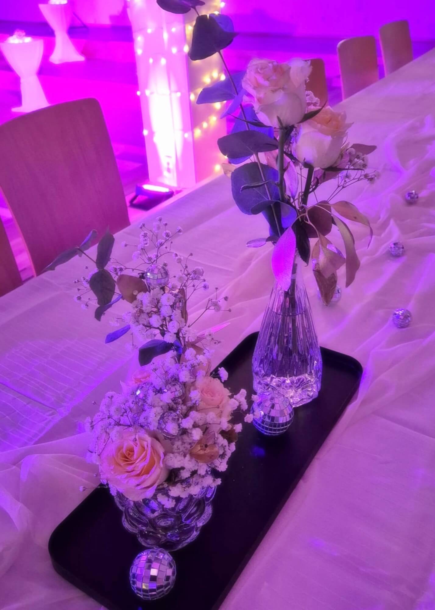 Alles war vergessen, als man dann in unser Forum kam, denn das wurde nach dem Motto Silvester/Neujahr geschmückt. Überall hingen Lichterketten. Das Highlight der Deko waren jedoch die vielen Discokugeln: ob auf den Tischen, als Blumenvasen oder an der Decke.