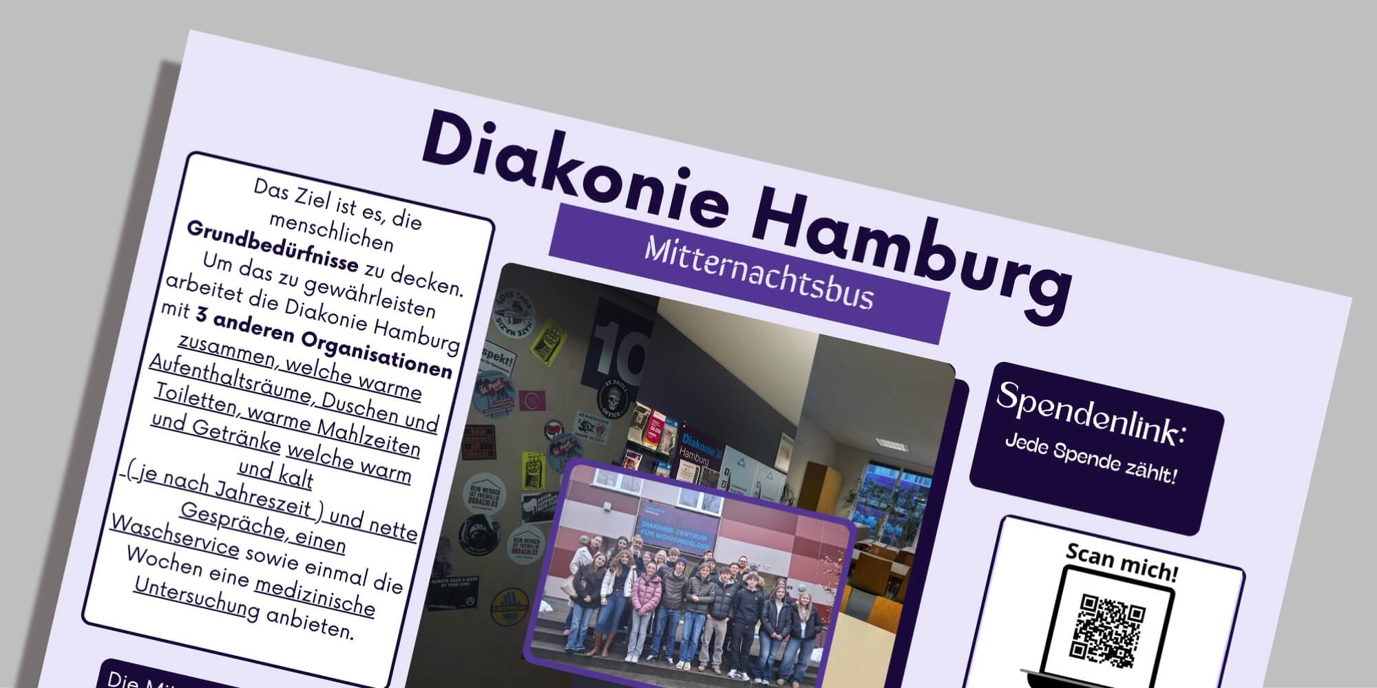 Unser Projekt hat uns gezeigt, wie viel man als Klasse gemeinsam erreichen kann – nicht nur finanziell, sondern auch menschlich. Wir hoffen, dass wir mit unserem Engagement einen kleinen Beitrag leisten konnten, und dass auch in Zukunft viele Menschen diese wichtige Arbeit unterstützen. Auf dem Plakat kommen Sie zu dem Spendenlink. Wie bereits erwähnt, ist ein sehr wichtiger Teil auch die ehrenamtliche Mitarbeit. Dies nimmt auch gar nicht viel Zeit ein. Zum Beispiel ein Abend im Monat, in dem man beim Bus mitfährt. Lasst uns zusammen die Welt ein bisschen besser machen!